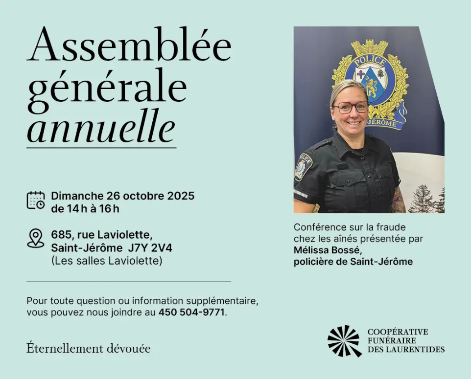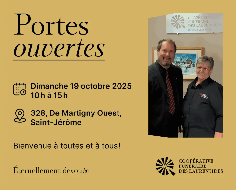 La Coopérative funéraire des Laurentides vous invite à participer à ses évènements gratuits dont les objectifs sont d'éduquer, de donner de la visibilité aux organismes communautaires de la région des Basses-Laurentides et d'honorer sa promesse de participer au développement socio-économique de nos collectivités.