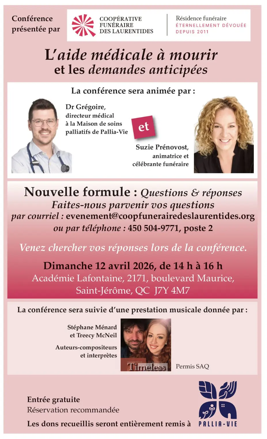 Pour cette 3e édition, nous proposons une formule entièrement interactive : un dialogue en questions-réponses entre le public et le Dr Charles-Matthieu Grégoire, animé par Suzie Prénovost.