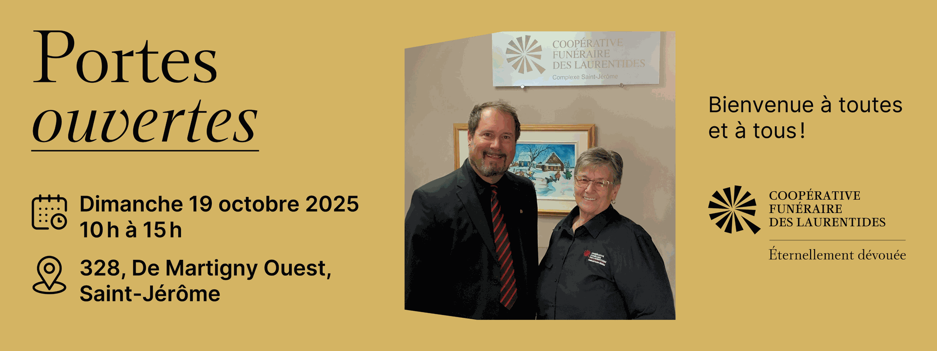 Vous aimeriez en savoir plus sur les rituels funéraires, l’embaumement, la crémation et les arrangements préalables? L’équipe dévouée de votre coopérative vous donne rendez-vous afin de répondre à toutes vos questions. Vous pourrez également visiter les lieux et plus encore!